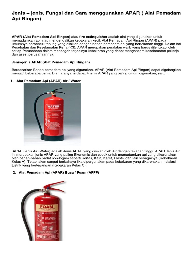 Alat pemadam api jenis air (water) kandungan: Meskipun banyak manfaat yang diberikan oleh apar ini, namun jika tidak dirawat, manfaat dari apar ini bisa saja tidak kita dapatkan secara. Alat pemadam api jenis abc juga mempunyai manfaat lain yaitu bisa diaplikasikan pada kelas kebakaran a, b dan c. Definisi alat pemadam api alat yang digunakan bergantung kepada kelas api dan bahan yang terbakar. Alat pemadam api yang sering digunapakai adalah jenis dry powder kerana efektif untuk memadamkan kebakaran hampir semua kelas.cara menggunakan alat pemadam api sangat mudah. Alat pemadam ini juga bisa digunakan untuk memadamkan api outdoor/indoor. Jenis alat pemadam api powder digunakan di seluruh dunia yang dioperasikan oleh tekanan n2 maupun cartridge tersedia dalam bahan kimia kering dan jenis ini menerima peringkat kelasnya a dari kemampuan agen mencair dan mengalir pada 177 ° c (350 ° f) untuk memadamkan api. Kami tawarkan rangkaian komplit deteksi serta system pemadaman api dengan cost. Alat pemadam api merupakan satu alat yang diperlukan bagi memadam atau mengawal api kebakaran di peringkat awal. Apar jenis air (water) adalah jenis apar yang disikan oleh air dengan tekanan tinggi. 20 kaki hingga 25 kaki jangkamasa pancutan: Alat pemadam api boleh dibahagikan kepada beberapa jenis. Pemadamanya lebih berkesan jika dibandingkan.